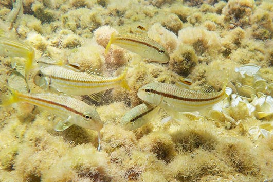 Sehr häufig ist die barschverwandte Streifenbarbe in den Meeren des Cilento anzutreffen. Meist suchen Sie an steinigem oder sandigem Boden nach Nahrung. Jungtiere halten sich in der Regel in Schwärmen auf, während die ausgewachsenen Exemplare, welche eine Länge von 25 cm erreichen können, eher ein Einzelschwimmer ist. Das Foto habe ich in einer Bucht in Santa Maria di Castellabate aufgenommen.